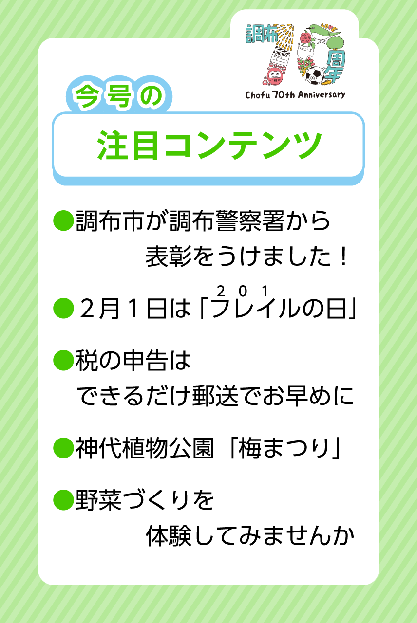 トップページ > 市政情報 > 広報 > 市報ちょうふ > 令和8(2026)年発行 > 市報ちょうふ令和8年2月5日号